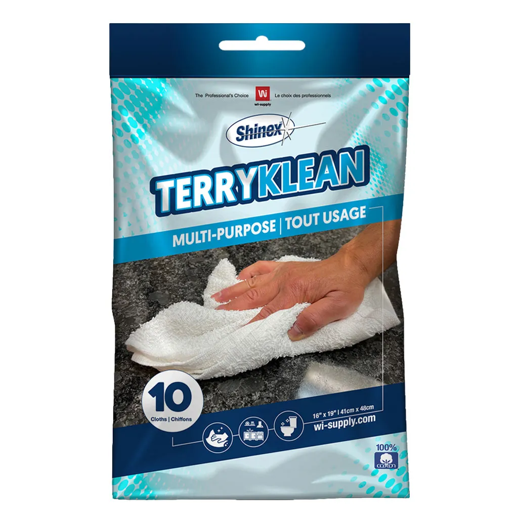 Wipeco Shinex™ Multi-Purpose Terry Towels are crafted from 100% bleached cotton, ensuring a soft and absorbent experience. With a generous finished size of 16”x19” (41cm x 48cm), these towels are designed for versatility and efficiency. They are not only highly absorbent but also durable, allowing for repeated washing and reuse. Each pack contains ten towels, making them a practical choice for various cleaning tasks.